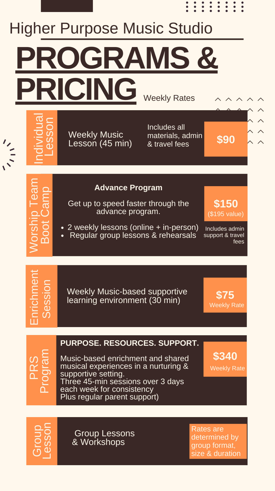 Every student is unique, and we believe their music journey should be too. We take time to explore which services are the best fit for each student’s goals, interests, and learning style. From lesson structure to musical focus, our curriculum is thoughtfully tailored to meet individual needs and help every student grow with confidence and purpose.